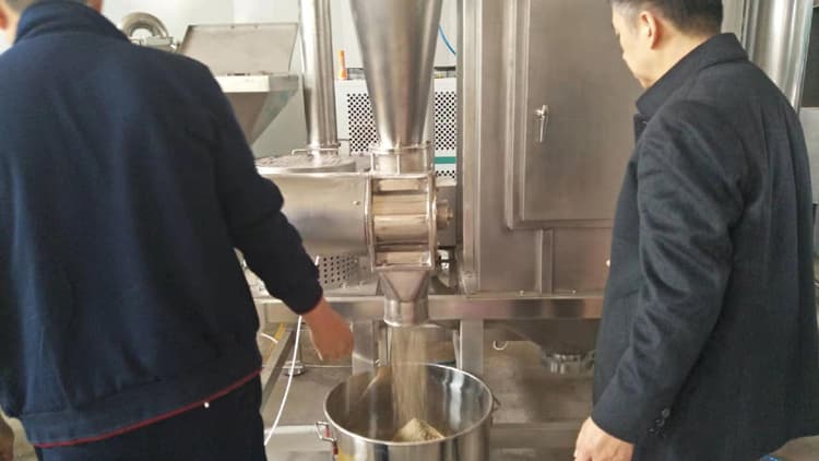 代餐粉的營養(yǎng)價值各不相同,添加不同的原料會產生不同的保健功能。今天我們會介紹一種營養(yǎng)價值非常高的代餐粉,它是由黑豆,小赤豆,薏仁,黑米,花生,核桃,干棗片,枸杞,芝麻等五谷雜糧及人參等一些名貴中藥材按照一定的營養(yǎng)配比混合而成,成分高達40多種。這款物料中含油性及粘性物料給五谷代餐粉的生產加工帶來了一定的難度。并且它的粉末細度要求80-100目,油性及粘性的物料在粉碎過程容易堵塞粉碎機腔,以往普通的超微粉碎機很難粉碎到這個細度??蛻魩Я蟻砉S試機,技術人員對機腔進行一定的整改,代餐粉的粉碎加工順利完成。在沒有使用液氮冷凍粉碎機的情況下,能夠達到這樣的細度和產量,已經非常成功了。