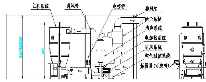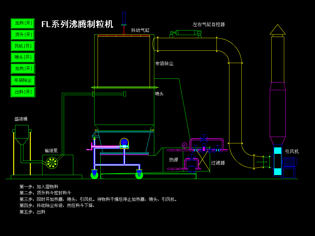 設(shè)備由流化床(原料容器)和噴霧干燥室、捕集室、頂升系統(tǒng)以及基座、霧化系統(tǒng)、加熱系統(tǒng)、空氣過濾系統(tǒng)和引風(fēng)系統(tǒng)組成。當(dāng)設(shè)備啟動(dòng)后主機(jī)各容器自動(dòng)密封,在引風(fēng)機(jī)的抽吸下,設(shè)備內(nèi)部形成一定量的負(fù)壓(可調(diào)),物料受負(fù)壓的作用,自流化床內(nèi)向上運(yùn)動(dòng)至噴霧干燥室,由于噴霧干燥室的空間較流化床大,負(fù)壓下所產(chǎn)生的氣流在此部分流速變緩,從而物料自身重力克服了負(fù)壓氣流的推力后自然下落,當(dāng)下落至一定高度后負(fù)壓產(chǎn)生的氣流推力大于物料自重時(shí)物料又向干燥室方向運(yùn)動(dòng),以此往復(fù)形成流化狀態(tài)。通過對(duì)負(fù)壓氣流的調(diào)節(jié),使物料形成良好的流化態(tài),從而達(dá)到*佳的制粒干燥效果。